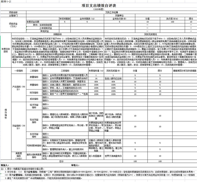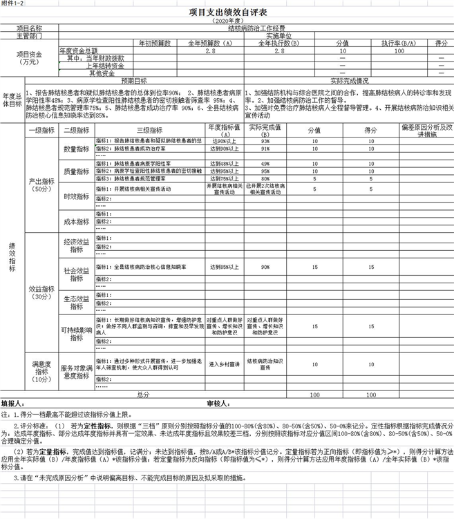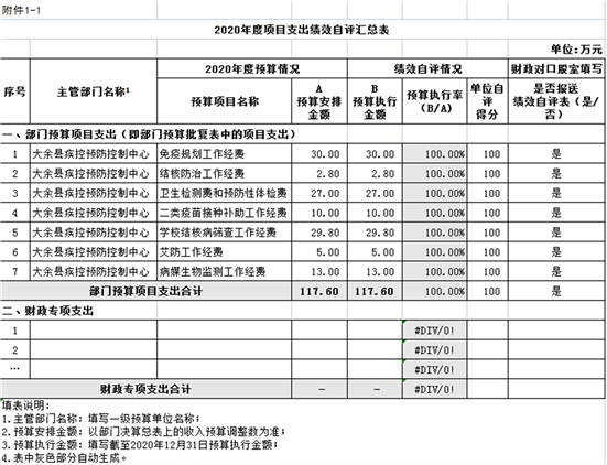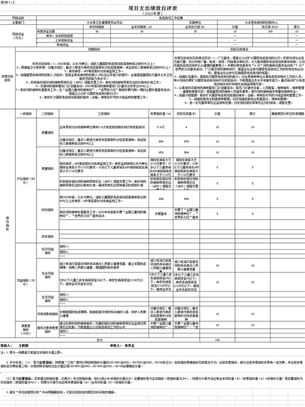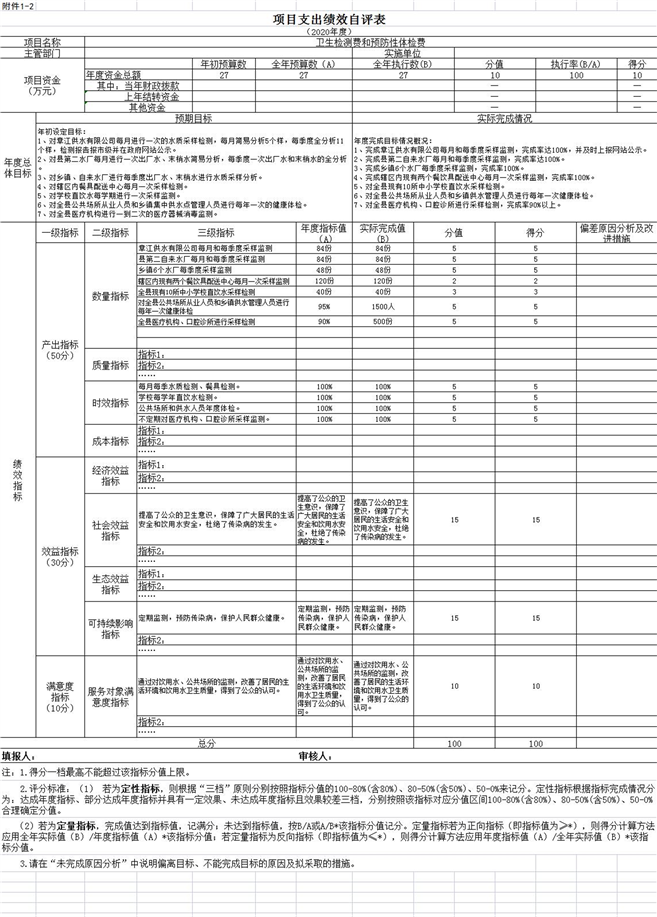 部門決算中項目績效自評結(jié)果。加強適齡兒童的免疫接種,對2020年1-12月份卡介苗(BCG)、乙肝疫苗(HepB)、脊髓灰質(zhì)炎減毒活疫苗(OPV)、百日咳白喉破傷風(fēng)三聯(lián)疫苗(DPT)、含麻疹成份類疫苗(MCV)、白喉破傷風(fēng)二聯(lián)疫苗(DT)、A群流行性腦脊髓膜炎夾膜多糖疫苗(MenA)、乙型腦炎減毒活疫苗(JE—I)、甲型肝炎減毒活疫苗(HepA—I)等9種疫苗常規(guī)免疫基礎(chǔ)預(yù)防接種率監(jiān)測數(shù)據(jù)進行了統(tǒng)計,其中卡介苗接種2176劑次,脊灰疫苗9229劑次,百白破9212劑次,乙肝疫苗7429劑次,乙腦疫苗5845劑次,A群流腦3454劑次,流腦A+C疫苗8184劑次,甲肝疫苗4115劑次,白破3850劑次,麻風(fēng)疫苗1315劑次,麻腮風(fēng)疫苗4408劑次,共報告一類苗59217劑次。從各疫苗報告接種率情況來看,接種率均高于90%,含麻疫苗接種率高于95%。繼續(xù)鞏固提高疫苗接種質(zhì)量,提高疫苗的接種率。疫苗可預(yù)防性傳染病持續(xù)保持低發(fā)水平,達(dá)到國家要求控制指標(biāo)內(nèi)。報告肺結(jié)核患者和疑似肺結(jié)核患者的總體到位率93%。肺結(jié)核患者成功治療率91%。肺結(jié)核患者病原學(xué)陽性率49%。病原學(xué)檢查陽性肺結(jié)核患者的密切接觸者篩查率95%。肺結(jié)核患者規(guī)范管理率80%。開展2次結(jié)核病相關(guān)宣傳活動。全縣結(jié)核病防治核心信息知曉率90%。通過多種形式開展宣傳,進一步加強老年人篩查機制;對全縣中學(xué)及九年制學(xué)校的七年級學(xué)生、普通高中及職業(yè)中專一年級的新生結(jié)核病新生篩查率93%。學(xué)校病原學(xué)檢查陽性肺結(jié)核患者的密切接觸者篩查率100%。疫情處置率100%。開展1次結(jié)核病相關(guān)宣傳活動。全縣高初中學(xué)生結(jié)核病防治核心信息知曉率達(dá)到85%以上。通過多種形式開展宣傳,進一步加強新生入學(xué)篩查機制,使大眾人群得到認(rèn)可。艾滋病監(jiān)測哨點完成率不低于95%;對各哨點的工作人員開展哨點監(jiān)測培訓(xùn);當(dāng)年新入所的吸毒、賣淫嫖娼等高危人群全部接受免費艾滋病病毒抗體檢測、對其他被監(jiān)管人員可開展自愿咨詢檢測、完成任務(wù)要求的監(jiān)測人數(shù);VCT檢測對象開展艾滋病和梅毒檢測,完成年度檢測咨詢?nèi)蝿?wù)量;100%縣級及以上醫(yī)療衛(wèi)生機構(gòu)主動為有艾滋病感染風(fēng)險的就診者提供必要的艾滋病和梅毒檢測咨詢服務(wù);覆蓋100所高校,至少開展1次艾滋病知識講座或宣傳教育活動;各監(jiān)測點開展5類性病報告準(zhǔn)確性核查及漏調(diào)查,加強性病報卡審卡工作,性病報卡準(zhǔn)確性達(dá)95%以上,漏報在3%以內(nèi);國家級性病監(jiān)測點開展監(jiān)測相關(guān)資料收集、患病率調(diào)查、三期梅毒個案流調(diào)及醫(yī)院哨點監(jiān)測等工作;開展醫(yī)療機構(gòu)性病防治綜合督導(dǎo),督促其落實《梅毒控制規(guī)劃》各項措施;培訓(xùn)疾控機構(gòu)和醫(yī)療機構(gòu)的疫情管理人員;利用攜手醫(yī)訪新媒體對性病就診者發(fā)放電子干預(yù)包,達(dá)到規(guī)定人數(shù);完成性病就診者艾滋病梅毒檢測任務(wù)數(shù);管理病人,按規(guī)范對病人隨訪、服藥、救治、政策享受等工作要求。完成檔案資料管理,艾滋病疫情繼續(xù)控制在低流行水平。病媒生物監(jiān)測2020年鼠類監(jiān)測6次、蚊類監(jiān)測24次、蠅類監(jiān)測12次、蠊類監(jiān)測6次,完成了全年計劃目標(biāo);2020年未發(fā)生病媒生物相關(guān)傳染病;病媒生物密度符合國家要求標(biāo)準(zhǔn);病媒生物防治消殺水平降低20%以上;病媒生物監(jiān)測群眾滿意度達(dá)到90%。完成章江供水有限公司每月和每季度采樣監(jiān)測84份,完成率達(dá)100%,并及時上報網(wǎng)站公示。完成縣第二自來水廠每月和每季度采樣監(jiān)測84份,完成率達(dá)100%。完成鄉(xiāng)鎮(zhèn)6個水廠每季度采樣監(jiān)測48份,完成率100%。完成轄區(qū)內(nèi)現(xiàn)有兩個餐飲具配送中心每月一次采樣監(jiān)測120份,完成率100%對全縣現(xiàn)有10所中小學(xué)校直飲水采樣檢測40份,完成率100%。對全縣公共場所從業(yè)人員和鄉(xiāng)鎮(zhèn)供水管理人員進行每年一次健康體檢1500人。對全縣醫(yī)療機構(gòu)、口腔診所進行采樣檢測,完成率90%以上。