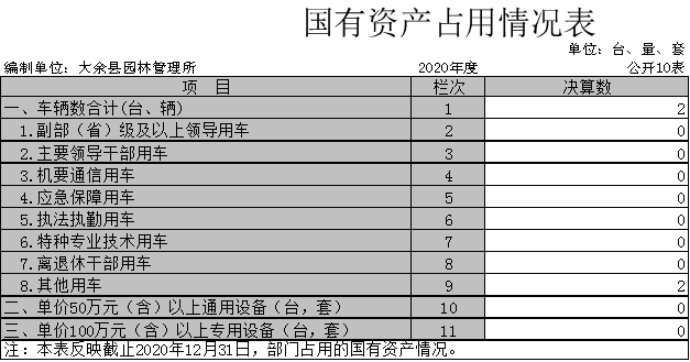 截止2020年12月31日,本部門國有資產占用情況見公開09表《國有資產占用情況表》。其中車輛中的其他用車主要是環衛作業灑水車。單位價值50萬元以上通用設備0臺;單位價值100萬元以上專用設備0臺。