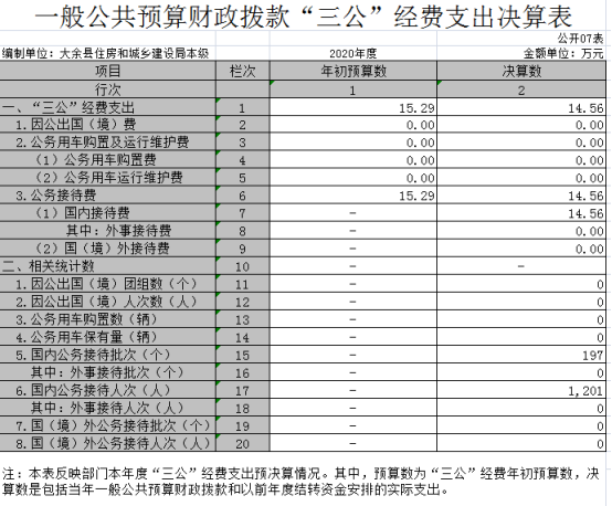 (二)公務接待費支出年初預算數為15.29萬元,決算數為 14.56萬元,完成預算的95.23%,決算數較2019年增加7.61 萬元,增長109.50%,主要原因是機構改革,大余縣房地產管理局并入,額度并入。決算數較年初預算數減少的主要原因是:厲行節檢,壓縮經費支出。全年國內公務接待197 批,累計接待1201人次,其中外事接待0批,累計接待0人次,主要為:省市主管部門督查檢查、兄弟縣市交流學習、招商引資商務接待等。