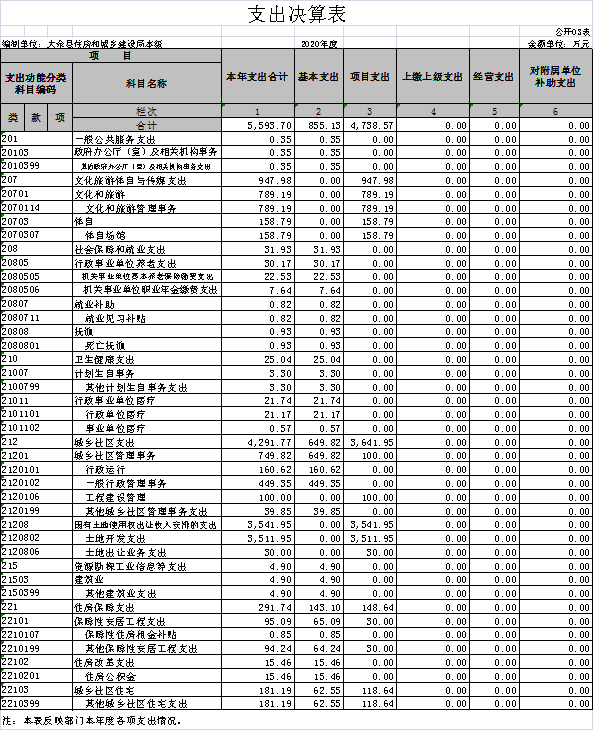 大余縣住房和城鄉建設局本級2020年度財政撥款本年支出年初預算數為877.85萬元,決算數為5593.7萬元,完成年初預算的637.20%。其中: