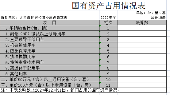 截止2020年12月31日,大余縣住房和城鄉建設局本級國有資產占用情況見公開10表《國有資產占用情況表》。無其他用車占用情況。