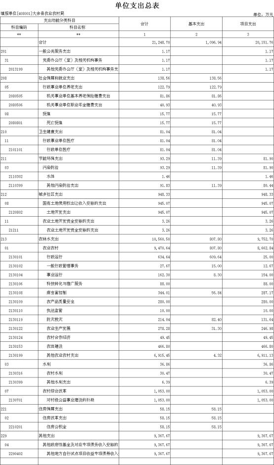 按支出項目類別劃分:基本支出1096.94萬元,較上年預算安排增加145.39萬元,主要原因是:項目增加;其中:工資福利支出799.03萬元,商品和服務支出58.73萬元,對個人和家庭的補助22.11萬元,資本性支出0萬元。項目支出20151.76萬元,較上年預算安排增加16379.37萬元,主要原因是:項目增加,其中:農林水支出934.39萬元,工資福利支出0萬元,商品和服務支出0萬元,對個人和家庭的補助0萬元,資本性支出0萬元,對企業補助0萬元。