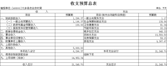 2022年大余縣農業農村局本級財政撥款支出預算總額為財政撥款支出預算總額1296.37萬元,較上年預算安排減少1471.77萬元,主要原因是:減少項目資金預算;
