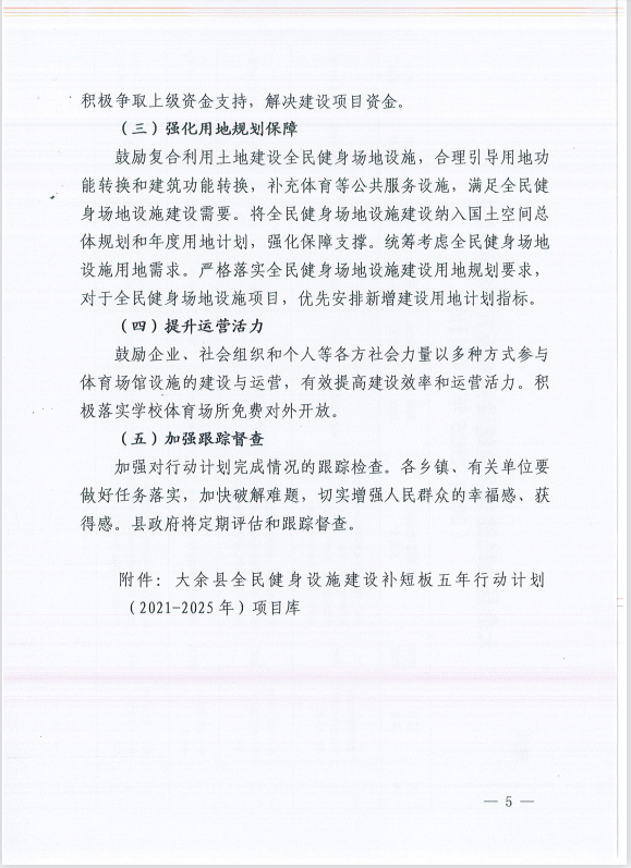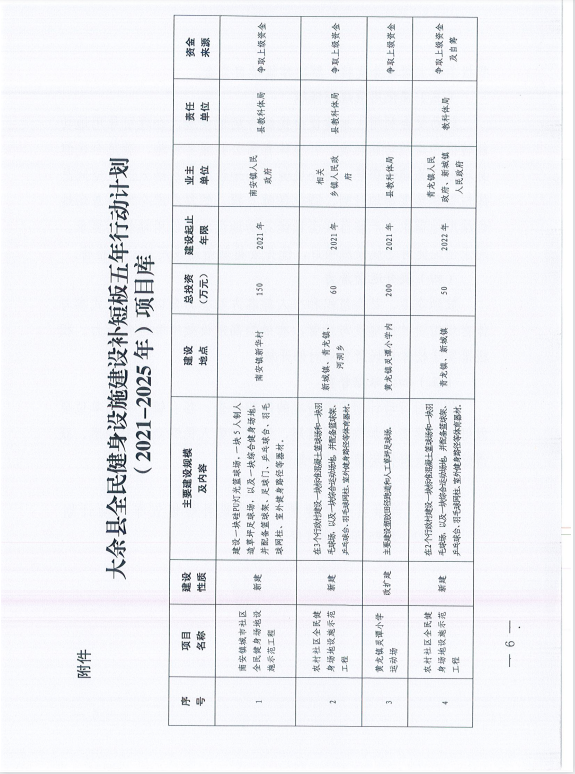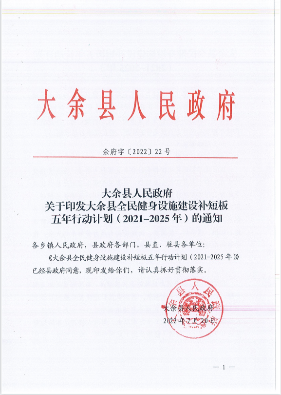 余府字〔2021〕22號大余縣人民政府關于印發大余縣全民健身設施建設補短板五年行動計劃(2021-2025年)的通知