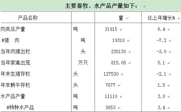 全年生豬出欄 235130 頭,比上年下降 3%;家禽出籠 815.05 萬只,
