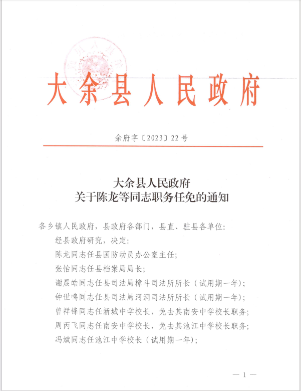 余府字〔2023〕22號大余縣人民政府關于陳龍等同志職務任免的通知