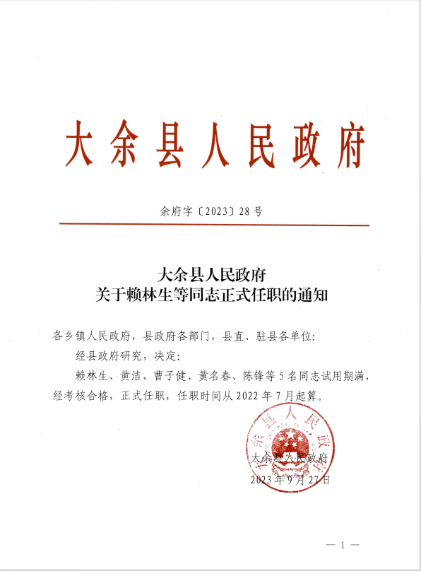 余府字〔2023〕28號大余縣人民政府關于賴林生等同志正式任職的通知