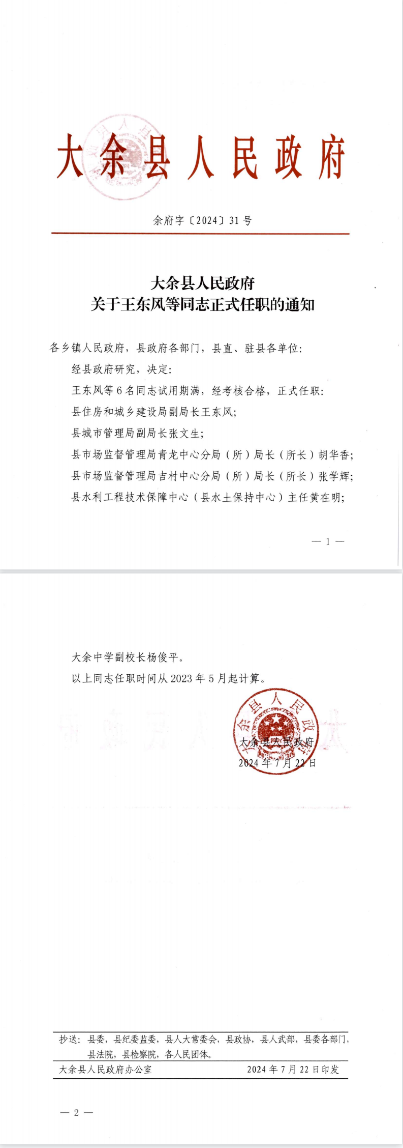 大余縣人民政府關(guān)于王東風等同志正式任職的通知