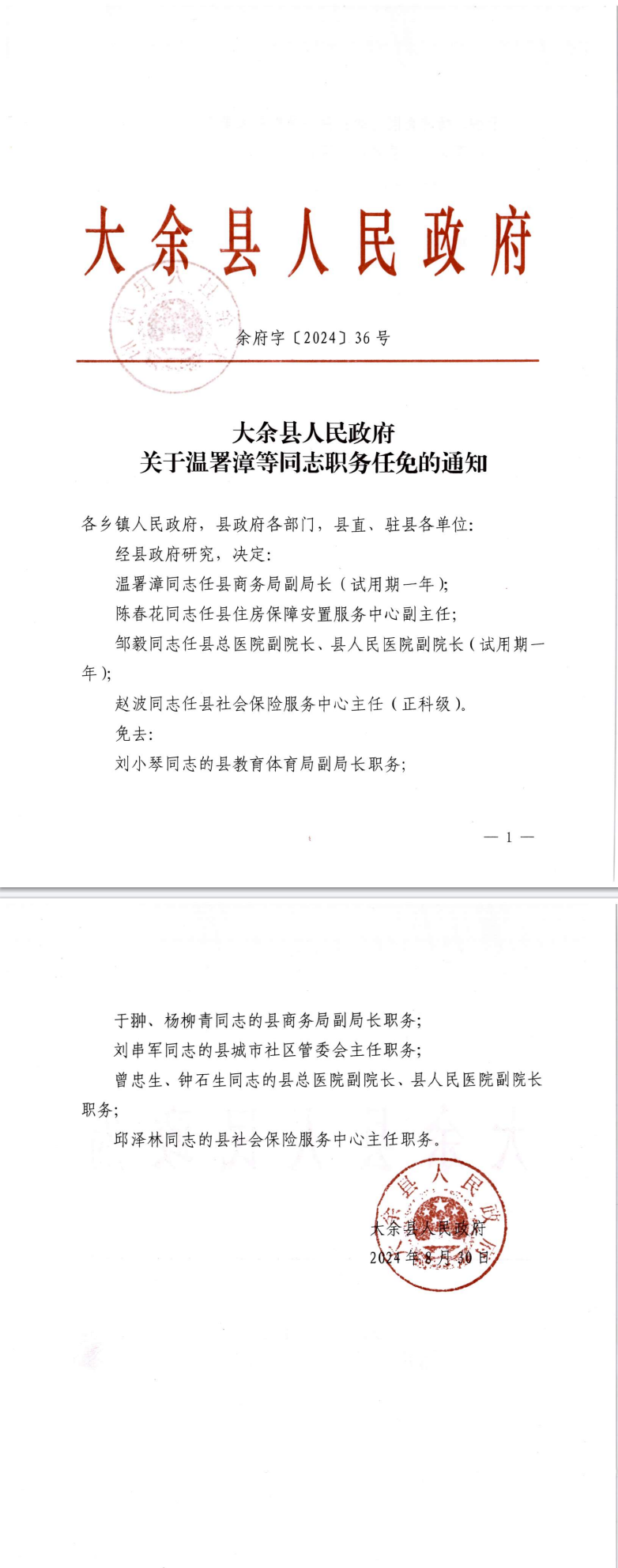 大余縣人民政府關于溫署漳等同志職務任免的通知