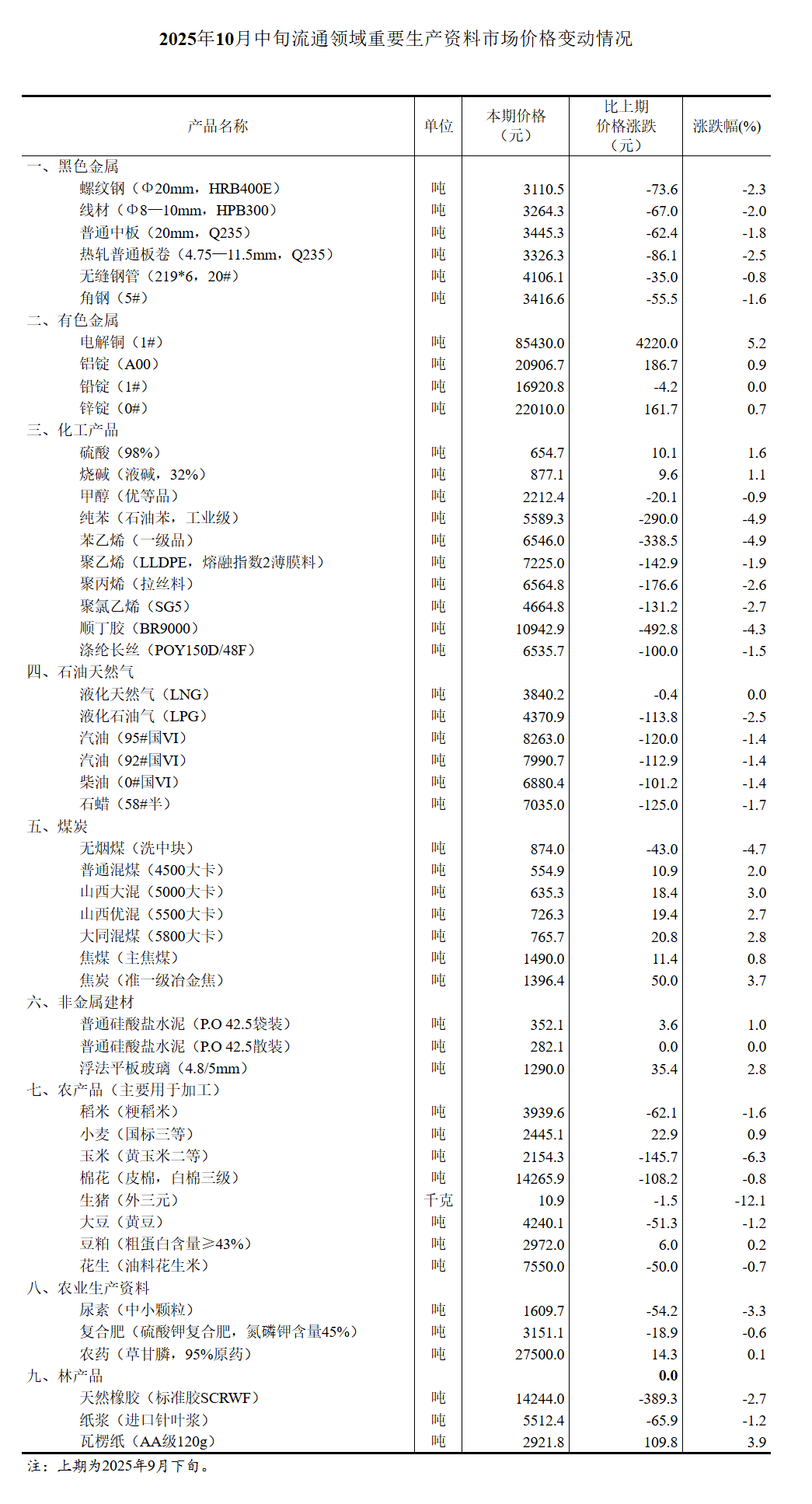 據(jù)對全國流通領域9大類50種重要生產(chǎn)資料市場價格的監(jiān)測顯示,2025年10月中旬與9月下旬相比,17種產(chǎn)品價格上漲,30種下降,3種持平。