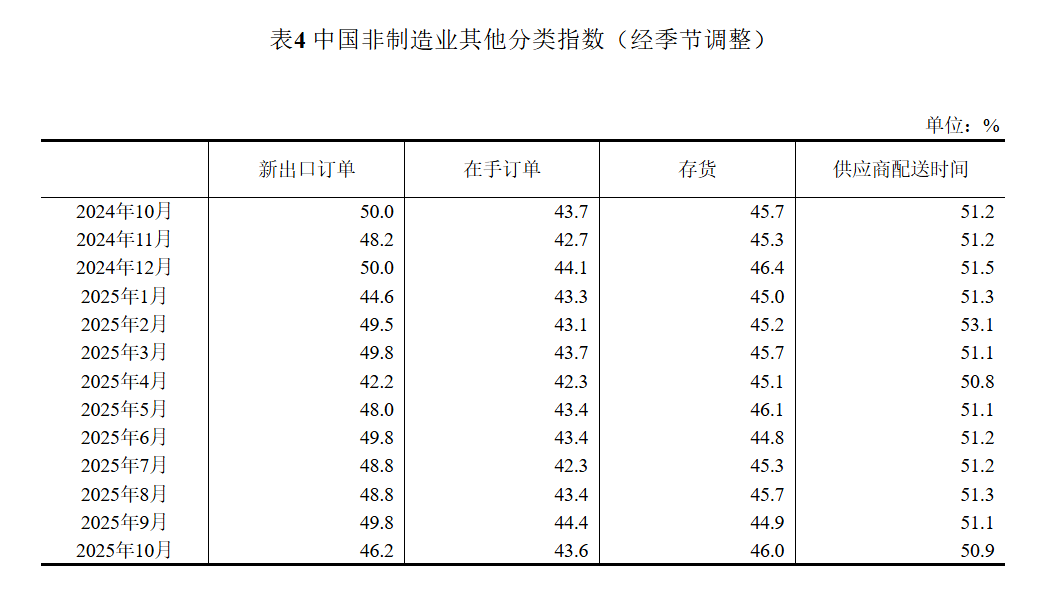 新訂單指數為46.0%,與上月持平,仍低于臨界點,表明非制造業市場需求景氣度偏弱。分行業看,建筑業新訂單指數為45.9%,比上月上升3.7個百分點;服務業新訂單指數為46.0%,比上月下降0.7個百分點。