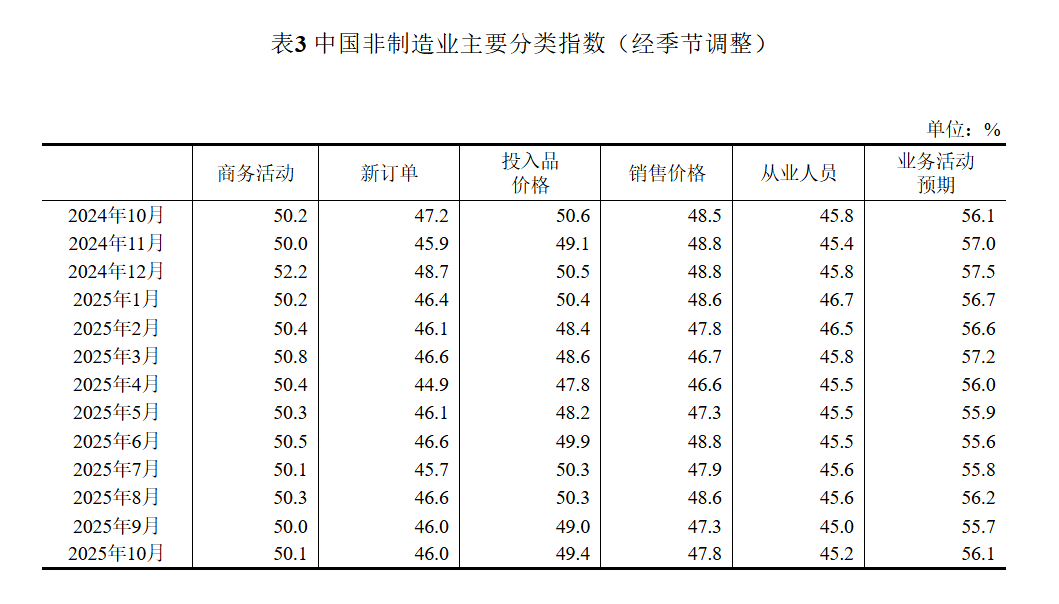 10月份,非制造業商務活動指數為50.1%,比上月上升0.1個百分點,升至擴張區間。