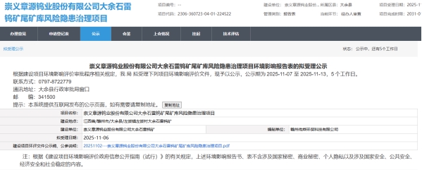 關于崇義章源鎢業股份有限公司大余石雷鎢礦尾礦庫風險隱患治理項目環境影響報告表的擬受理公示
