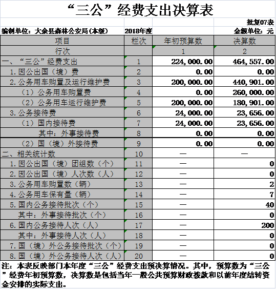 (四)“三公”經費:納入財政預決算管理的“三公”經費,是指部門用財政撥款安排的因公出國(境)費、公務用車購置及運行費和公務接待費。其中,因公出國(境)費反映單位公務出國(境)的國際旅費、國外城市間交通費、住宿費、伙食費、培訓費、公雜費等支出;公務用車購置及運行費反映單位公務用車車輛購置支出(含車輛購置稅)及租用費、燃料費、維修費、過路過橋費、保險費、安全獎勵費用等支出;公務接待費反映單位按規定開支的各類公務接待(含外賓接待)支出。