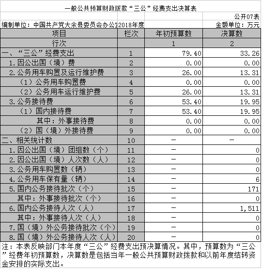 (九)“三公”經(jīng)費:納入財政預決算管理的“三公”經(jīng)費,是指部門用財政撥款安排的因公出國(境)費、公務用車購置及運行費和公務接待費。其中,因公出國(境)費反映單位公務出國(境)的國際旅費、國外城市間交通費、住宿費、伙食費、培訓費、公雜費等支出;公務用車購置及運行費反映單位公務用車車輛購置支出(含車輛購置稅)及租用費、燃料費、維修費、過路過橋費、保險費、安全獎勵費用等支出;公務接待費反映單位按規(guī)定開支的各類公務接待(含外賓接待)支出。
