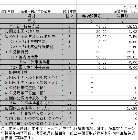 (八)“三公經費”:納入財政預決算管理的“三公”經費,是指部門用財政撥款安排的因公出國(境)費、公務用車購置及運行費和公務接待費。其中,因公出國(境)費反映單位公務出國(境)的國際旅費、國外城市間交通費、住宿費、伙食費、培訓費、公雜費等支出;公務用車購置及運行費反映單位公務用車車輛購置支出(含車輛購置稅)及租用費、燃料費、維修費、過路過橋費、保險費、安全獎勵費用等支出;公務接待費反映單位按規定開支的各類公務接待(含外賓接待)支出。
