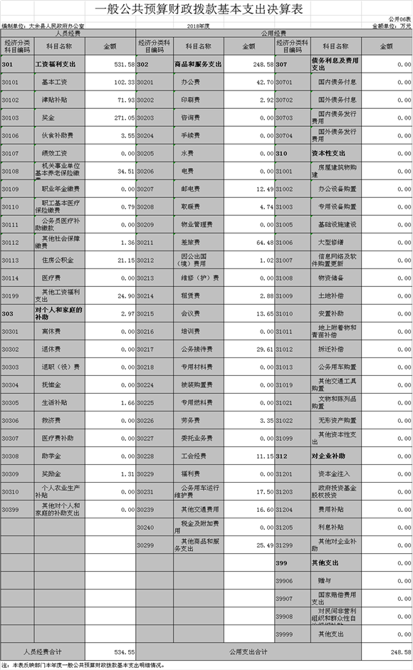 六、一般公共預算財政撥款基本支出決算表