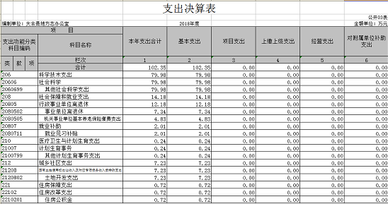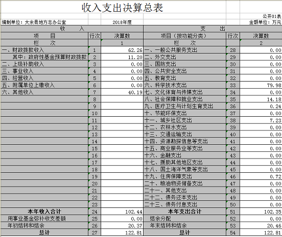 本部門2018年度支出總計 122.81 萬元,其中本年支出合計 102.35 萬元,較2017年增加 46.19萬元,增長82.24%,主要原因是:增加了社會保障和就業支出及編纂資金使用;年末結轉和結余 20.46 萬元,較2017年增加0.09 萬元,增長0.44 %。