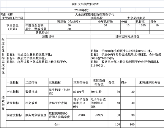 紙質(zhì)檔案數(shù)字化項目績效自評綜述:大余縣檔案館數(shù)字化項目建設(shè)周期為三年,自2018年開始,2020年完成。項目建設(shè)資金約182萬元,其中省級專項資金29萬元,剩余153萬元由縣財政按照2018年、2019年每年安排50萬元,2020年安排53萬元列入財政預(yù)算,全部預(yù)算執(zhí)行收支平衡,無超支現(xiàn)象。