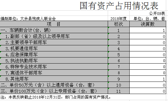 截止2018年12月31日,本部門共有車輛1輛,其中,副部(省)級及以上領導用車0輛、主要領導干部用車0輛、機要通信用車0 輛、應急保障用車0輛、執法執勤用車0輛、特種專業技術用車0 輛、其他用車 1 輛,其他用車主要是殘疾機動服務車;單位價值50萬元以上通用設備0臺(套);單位價值100萬元以上專用設備0臺(套)。
