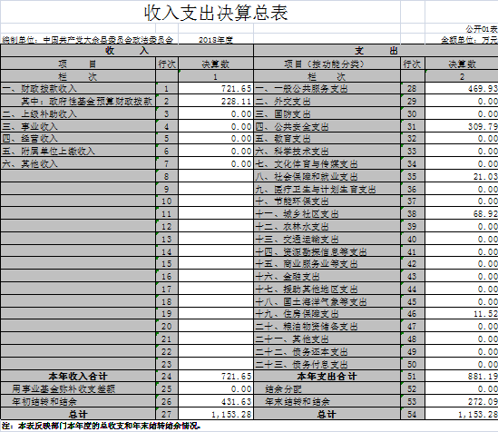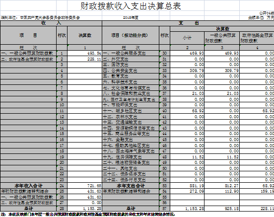我委2018年度收入總計1153.28萬元,其中年初結轉和結余431.63萬元,較2017年增加41.61萬元,增長4%;本年收入合計721.65萬元,較2017年減少526.07萬元,下降42%,主要原因是:結清了部分天網工程費用。