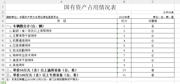 截至2018年12月31日,我委共有車輛5輛,其中,執法執勤用車4輛;一般公務用車 1輛(巡察工作用車)。單位價值50萬元以上通用設備0套;單位價值100萬元以上專用設備 0套。
