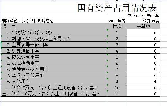 截止2019年12月31日,本部門共有車輛4輛,其中,副部(省)級及以上領導用車0輛、主要領導干部用車0輛、機要通信用車0輛、應急保障用車0輛、執法執勤用車0輛、特種專業技術用車0輛、其他用車4輛,其他用車主要是局公務用車、殯改辦和經濟核對中心用車,還有一輛報廢車無相關報廢手續保留在資產卡片;單位價值50萬元以上通用設備0臺(套);單位價值100萬元以上專用設備0臺(套)。