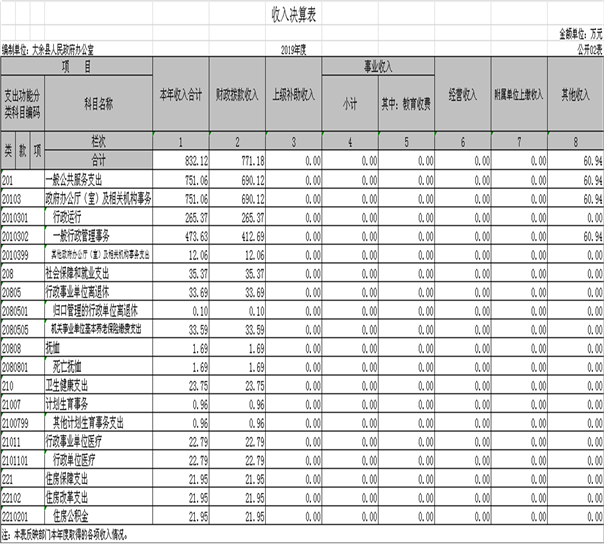 本部門2019年度收入總計1041.54萬元,其中年初結轉和結余209.41萬元,較2018年減少2.02萬元,下降1%;本年收入合計832.12 萬元,較2018年減少41.29萬元,下降4.7%,主要原因是2018年政府網站升級資金58萬元撥入到我單位付款。