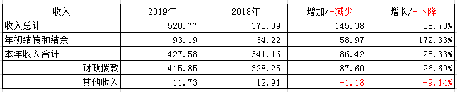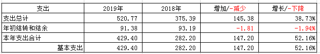 本部門2019年度收入總計520.77萬元,其中年初結(jié)轉(zhuǎn)和結(jié)余93.19萬元,較2018年增加58.97萬元,增長172.33%;本年收入合計427.58萬元,較2018年增加86.42萬元,增長25.33%,主要原因是:在2019年期間財政撥付了2018年年度經(jīng)濟普查工作經(jīng)費及正常人員變動。