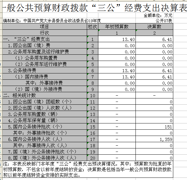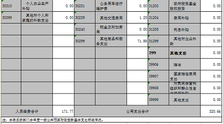 (五)“三公”經(jīng)費:納入財政預決算管理的“三公”經(jīng)費,是指部門用財政撥款安排的因公出國境費、公務用車購置及運行費和公務接待費。其中,因公出國境費反映單位公務出國境的國際旅費、國外城市間交通費、住宿費、伙食費、培訓費、公雜費等支出;公務用車購置及運行費反映單位公務用車車輛購置支出含車輛購置稅及租用費、燃料費、維修費、過路過橋費、保險費、安全獎勵費用等支出;公務接待費反映單位按規(guī)定開支的各類公務接待支出。
