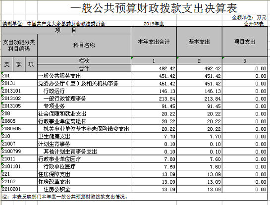(三)對個人和家庭補助支出0.34萬元,較2018年減少62.66萬元,下降99.46%,主要原因是:18年獲得省、市、縣的先進縣及先進單位稱號。
