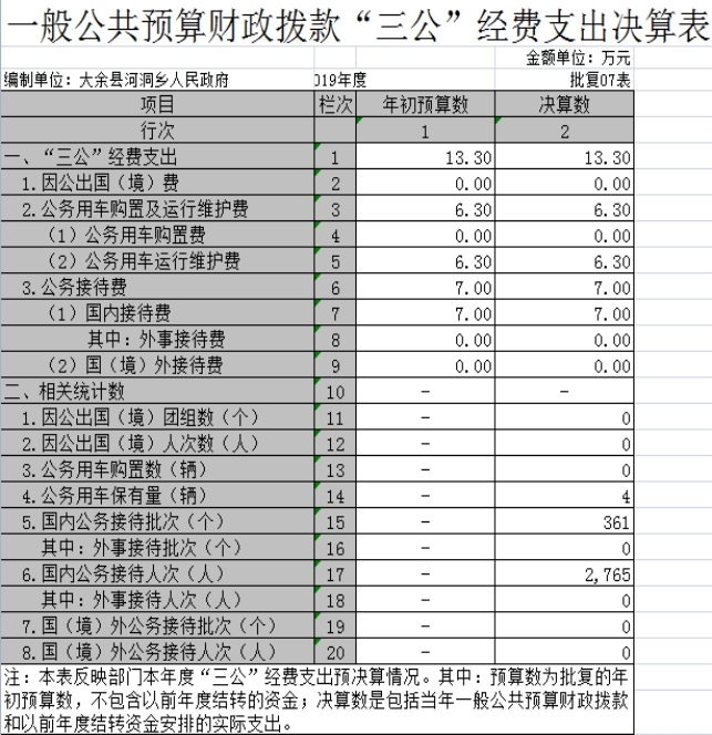 (二)公務接待費支出年初預算數為7萬元,決算數為7萬元,完成年初預算的100%,決算數較2018年增加不變。