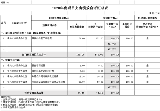 “縣委辦工作經費”項目績效自評綜述:根據年初設定的績效目標,項目績效自評得分為 100 分。項目全年預算數為171萬元,執行數為171萬元,完成預算的 100 %。績效指標完成成績:較好的完成了黨務辦公室各項工作,工作完成率100%,工作完成及時率100%,黨辦工作完成及時率100%,群眾滿意度100%。