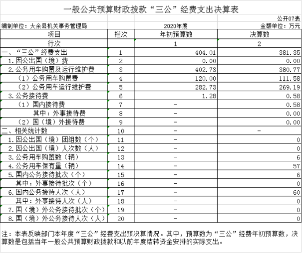 (五)“三公經(jīng)費(fèi)”:納入財(cái)政預(yù)決算管理的“三公”經(jīng)費(fèi),是指單位用財(cái)政撥款安排的因公出國(guó)(境)費(fèi)、公務(wù)用車(chē)購(gòu)置及運(yùn)行費(fèi)和公務(wù)接待費(fèi)。其中,因公出國(guó)(境)費(fèi)反映單位公務(wù)出國(guó)(境)的國(guó)際旅費(fèi)、國(guó)外城市間交通費(fèi)、住宿費(fèi)、伙食費(fèi)、培訓(xùn)費(fèi)、公雜費(fèi)等支出;公務(wù)用車(chē)購(gòu)置及運(yùn)行費(fèi)反映單位公務(wù)用車(chē)車(chē)輛購(gòu)置支出(含車(chē)輛購(gòu)置稅)及租用費(fèi)、燃料費(fèi)、維修費(fèi)、過(guò)路過(guò)橋費(fèi)、保險(xiǎn)費(fèi)、安全獎(jiǎng)勵(lì)費(fèi)用等支出;公務(wù)接待費(fèi)反映單位按規(guī)定開(kāi)支的各類(lèi)公務(wù)接待(含外賓接待)支出。