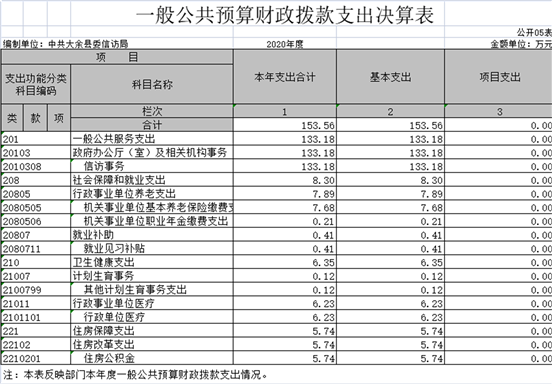 本部門2020年度支出總計153.56 萬元,其中本年支出合計153.56萬元,較2019年減少44.54萬元,下降22.48%,主要原因是:一般公共服務支出下降;年末結轉和結余49.13萬元,較2019年增加24.19萬元,增長15.76%,主要原因是:一般公共服務支出減少。