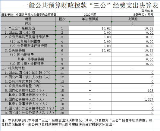 (二)公務接待費支出年初預算數為10.62萬元,決算數為 10.62萬元,完成預算的100%,決算數較2019年增加0萬元,增長0%,主要原因是節約支出,與上年持平。決算數較年初預算數增加的主要原因是:節約支出,與上年持平。全年國內公務接待123批,累計接待1327人次,其中外事接待0批,累計接待0人次,主要為:為縣宣傳商務接待。