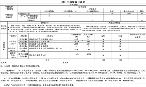 項目績效自評總體綜述:根據年初設定的績效目標,單位工作經費項目績效自評得分為94分。項目全年預算數為3萬元,執行數為3萬元,完成預算的100%。項目績效目標完成情況:一是履職完成情況。按照年初單位總體工作目標,較好地完成了年初制定的各項工作任務。二是履職效果情況。通過一年來的工作,取得了較好的績效成果,整體支出績效評價自評分為94分。發現的問題及原因:一是主要問題及原因分析。勞動競賽的參與性和專業性有待進一步提高。主要是在行業宣傳和專業培訓方面需進一步加強。二是改進的方向和具體措施。在行業監管方面加強工作力度,采取宣傳欄、廣告、多媒體等多種形式加強宣傳,使我縣職工技能素質、創新能力顯著提升,技術工人隊伍不斷壯大。