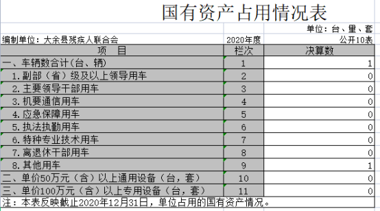 截止2020年12月31日,本單位國有資產占用情況見公開10表《國有資產占用情況表》。其中車輛中的其他用車主要是殘疾人流動服務車。