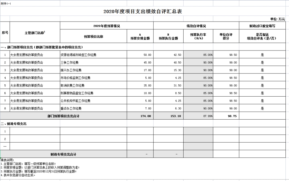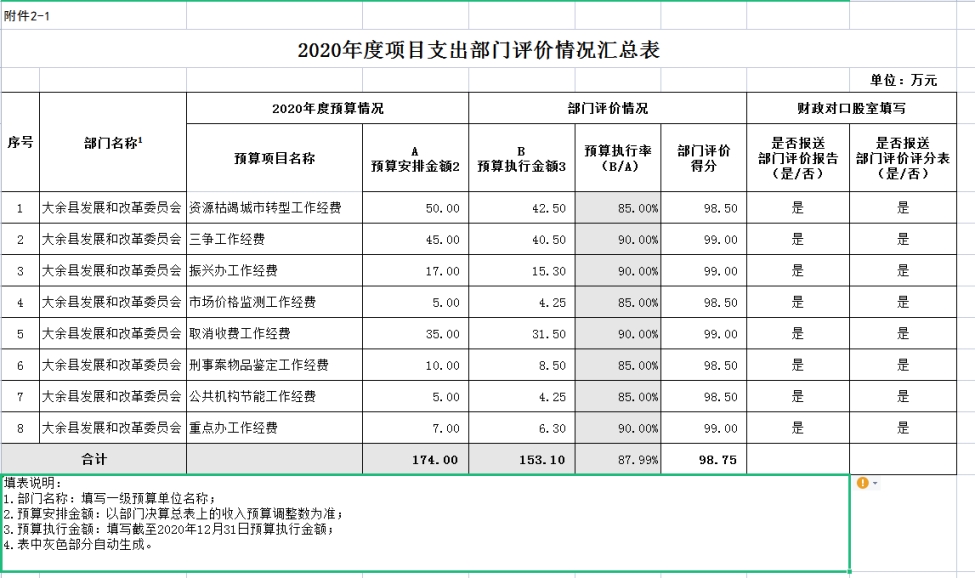 項目績效自評總體綜述:根據年初設定的績效目標,我委項目績效自評得分為 98.75 分。項目全年預算數為 174 萬元,執行數為 153.1萬元,完成預算的 87.99 %。