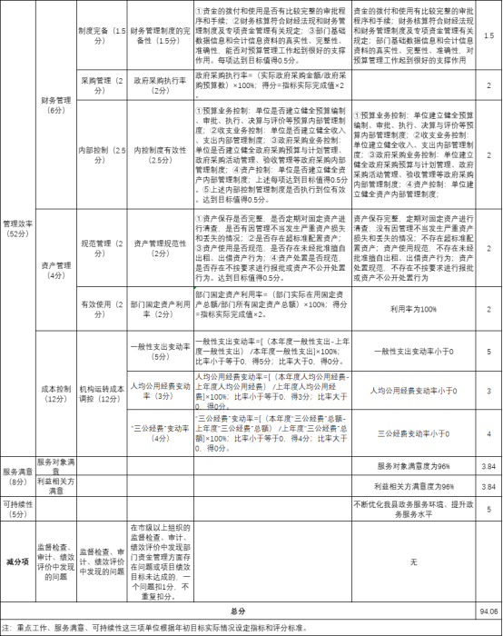 項目績效自評總體綜述:根據(jù)年初設(shè)定的績效目標,大廳運行經(jīng)費績效自評得分為97.67分。項目全年預(yù)算數(shù)為84.3萬元,執(zhí)行數(shù)為84.3萬元,完成預(yù)算的100%。項目績效目標完成情況:一是完善“贛服通”大余分廳建設(shè),二是強化中介服務(wù)超市運行,三是提升了投資項目審批效率,發(fā)現(xiàn)的問題及原因:制度建設(shè)有待進一步完善。為不斷提升“互聯(lián)網(wǎng)+政務(wù)服務(wù)”能力,有效提升我縣政務(wù)服務(wù)領(lǐng)域治理和治理能力現(xiàn)代化水平及,需進一步完善單位財務(wù)制度體系和績效評價體系,使各項財務(wù)工作有章可循,為提升財務(wù)服務(wù)質(zhì)量提供制度保障。