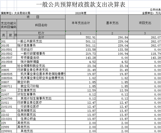 納入本套單位決算匯編范圍的單位共1個,包括:大余縣統(tǒng)計局本級、縣社情民意調查中心、統(tǒng)計執(zhí)法大隊。