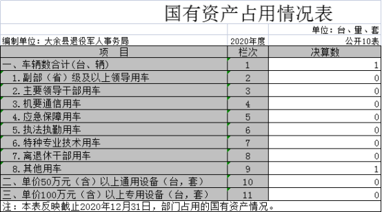 截止2020年12月31日,本部門(單位)國有資產占用情況見公開10表《國有資產占用情況表》。其中車輛中的其他用車1輛。