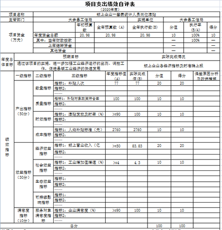 項(xiàng)目績(jī)效自評(píng)綜述:根據(jù)年初設(shè)定的績(jī)效目標(biāo),規(guī)上企業(yè)一套表統(tǒng)計(jì)人員崗位津貼項(xiàng)目績(jī)效自評(píng)得分100分。項(xiàng)目全年預(yù)算數(shù)為20.98萬(wàn)元,執(zhí)行數(shù)為20.98萬(wàn)元,完成預(yù)算的 100 %。項(xiàng)目績(jī)效目標(biāo)完成情況:加強(qiáng)了工業(yè)經(jīng)濟(jì)運(yùn)行的監(jiān)測(cè)和調(diào)控,為我縣工業(yè)經(jīng)濟(jì)指標(biāo)數(shù)據(jù)的報(bào)送做出了貢獻(xiàn)。發(fā)現(xiàn)的問(wèn)題及原因:隨著國(guó)家對(duì)工業(yè)統(tǒng)計(jì)實(shí)行“一套表”改革,徹底改變了以往傳統(tǒng)的由紙質(zhì)報(bào)送到由電腦直接報(bào)送,企業(yè)有很多基礎(chǔ)性工作要做,大量增加了企業(yè)統(tǒng)計(jì)人員的工作負(fù)擔(dān)和工作難度,而由于補(bǔ)貼資金有限,工業(yè)統(tǒng)計(jì)人員的積極性有所下降。下一步改進(jìn)措施:進(jìn)一步加大項(xiàng)目經(jīng)費(fèi)投入,為次年工業(yè)統(tǒng)計(jì)工作提供更好的支持,更好的掌握企業(yè)發(fā)展情況。