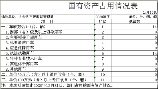 截止2020年12月31日,本部門國有資產占用情況見公開10表《國有資產占用情況表》。本部門共有車輛14輛(含3輛電動巡邏車),其中,副部(?。┘壖耙陨项I導用車0輛、主要領導干部用車0輛、機要通信用車0輛、應急保障用車0輛、執法執勤用車14輛、特種專業技術用車0輛、其他用車0輛;單位價值50萬元以上通用設備0臺(套);單位價值100萬元以上專用設備0臺(套)。