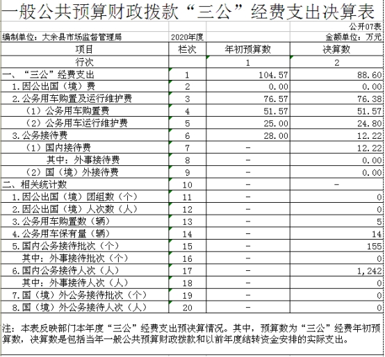 (五)“三公”經費:納入財政預決算管理的“三公”經費,是指部門用財政撥款安排的因公出國(境)費、公務用車購置及運行費和公務接待費。其中,因公出國(境)費反映單位公務出國(境)的國際旅費、國外城市間交通費、住宿費、伙食費、培訓費、公雜費等支出;公務用車購置及運行費反映單位公務用車車輛購置支出(含車輛購置稅)及租用費、燃料費、維修費、過路過橋費、保險費、安全獎勵費用等支出;公務接待費反映單位按規定開支的各類公務接待(含外賓接待)支出。