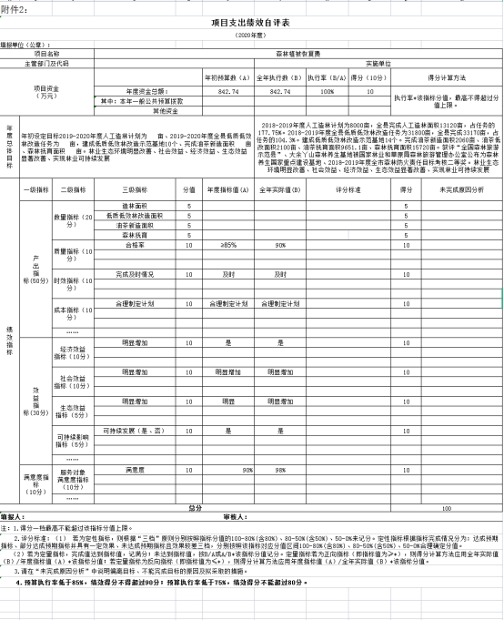 項目績效自評總體綜述:根據年初設定的績效目標,森林植被恢復費項目績效自評得分為 10 分。項目全年預算數為842.74 萬元,執(zhí)行數為842.74 萬元,完成預算的 100 %。項目績效目標完成情況:2018-2019年度人工造林計劃為8000畝,全縣完成人工造林面積13120畝,占任務的177.75%。2018-2019年度全縣低質低效林改造任務為31800畝,全縣完成33170畝,占任務的104.3%。建成低質低效林改造示范基地14個。完成油茶新造面積2060畝、油茶低改面積2100畝、油茶撫育面積9651.1畝、森林撫育面積15720畝。獲評“全國森林旅游示范縣”、大余丫山森林養(yǎng)生基地被國家林業(yè)和草原局森林旅游管理辦公室公布為森林養(yǎng)生國家重點建設基地、2018-2019年度全市森林防火責任目標考核二等獎。林業(yè)生態(tài)環(huán)境明顯改善、社會效益、經濟效益、生態(tài)效益顯著改善、實現(xiàn)林業(yè)可持續(xù)發(fā)展。