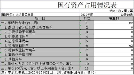 截止2020年12月31日,本部門共有車輛62輛,其中,副部(省)級及以上領導用車0輛、主要領導干部用車0輛、機要通信用車0輛、應急保障用車0輛、執法執勤用車62輛、特種專業技術用車0輛、其他用車0輛;單位價值50萬元以上通用設備0臺(套);單位價值100萬元以上專用設備0臺(套)。