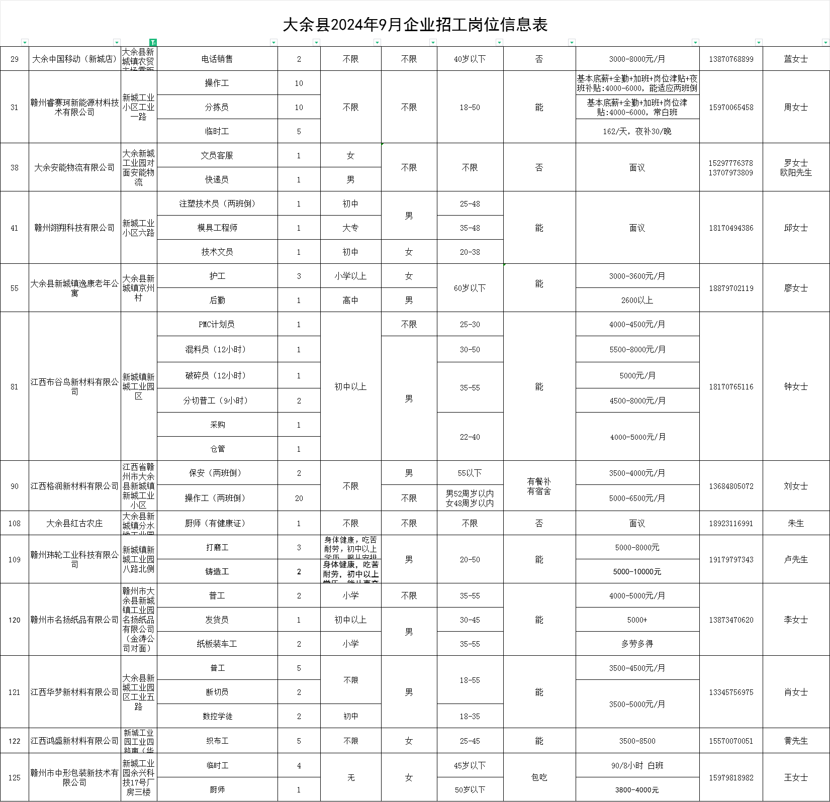 【招聘信息】大余縣2024年9月企業(yè)招工崗位信息表