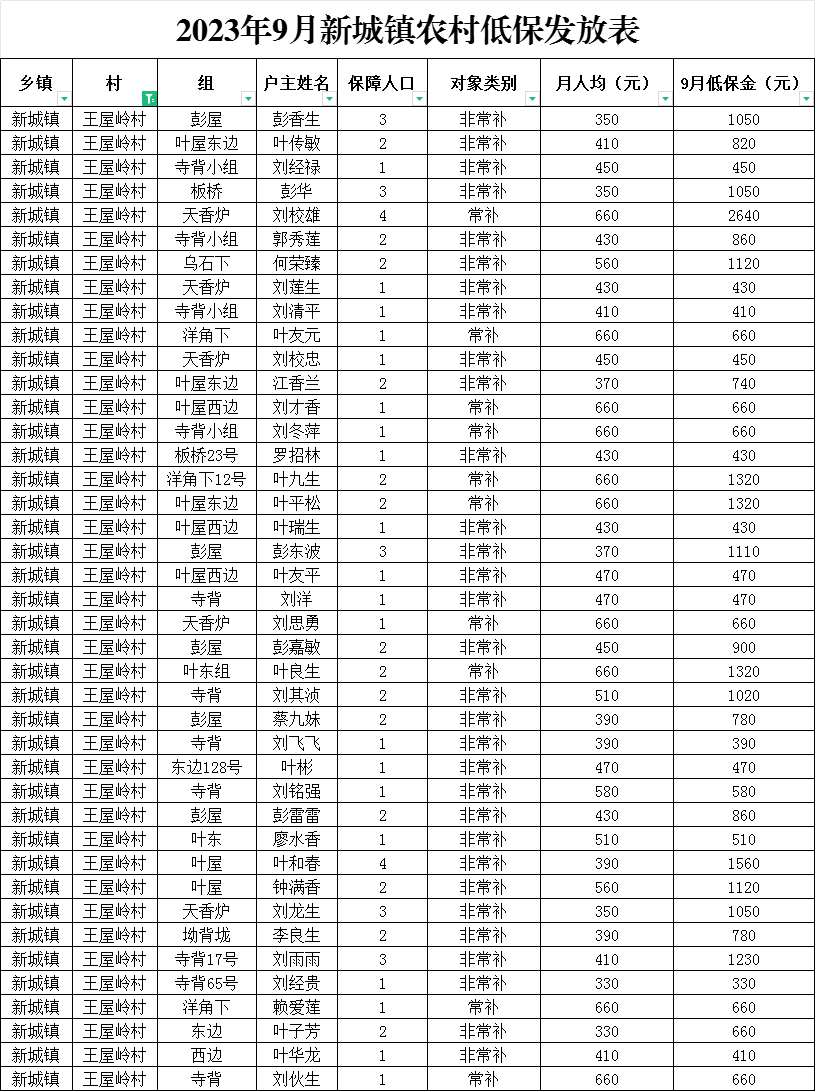 新城鎮王屋嶺村2023年9月農村低保發放公示