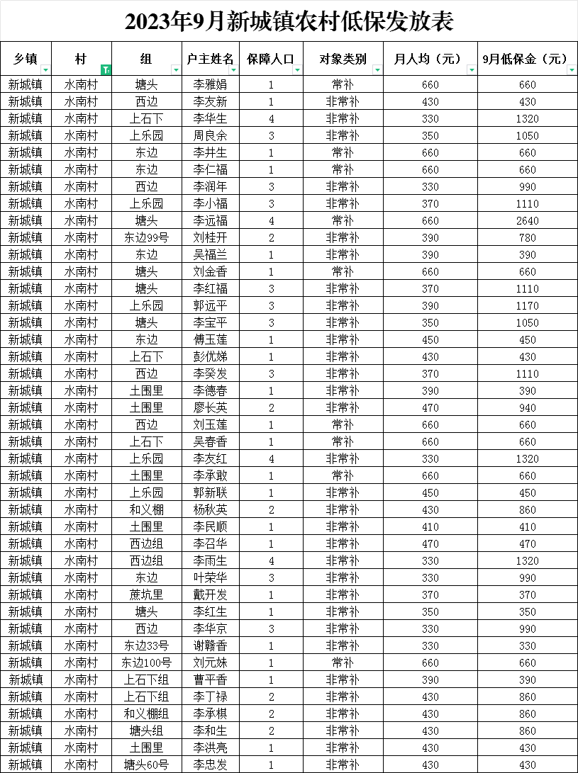 新城鎮(zhèn)水南村2023年9月農(nóng)村低保發(fā)放公示